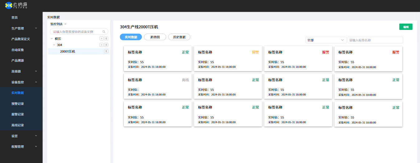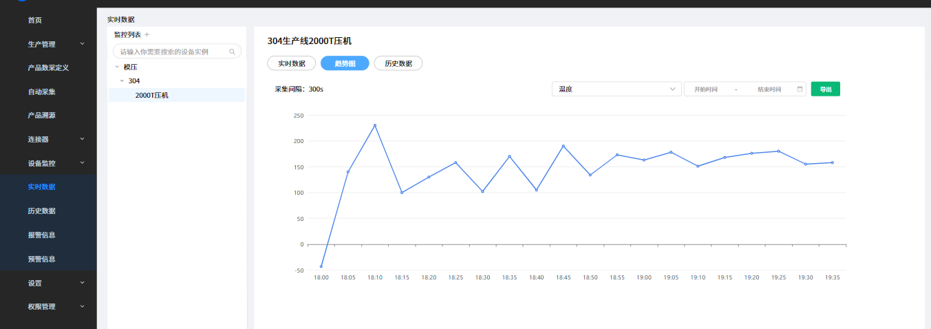 支持通过趋势图实时分析设备生产数据,并可查看或导出设备历史数据